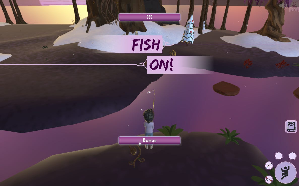 Also, you can go fishing! Press the fishing rod icon to take out your fishing pole and press/hold it again to cast your lure. If it lands in a body of water and you wait for a bit, you’ll probably hook a fish! Right now fishing is a passive activity, but we have some fun ideas for ways to add some depth to the experience without losing the sense of relaxation.